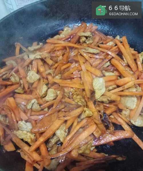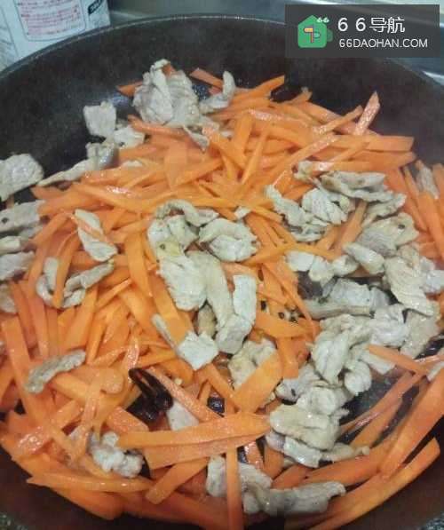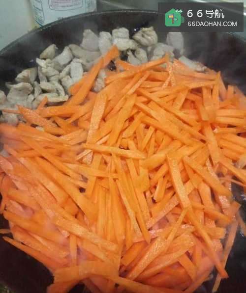 5猪肉变色后,放入切好的胡萝卜进行翻炒。