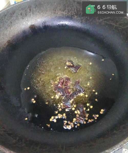 3取一个炒锅,然后开中火加热后,放入多一些的食用油(因为后面还要炒胡萝卜,所以放多一点油),然后用剪刀把辣椒剪入锅中。