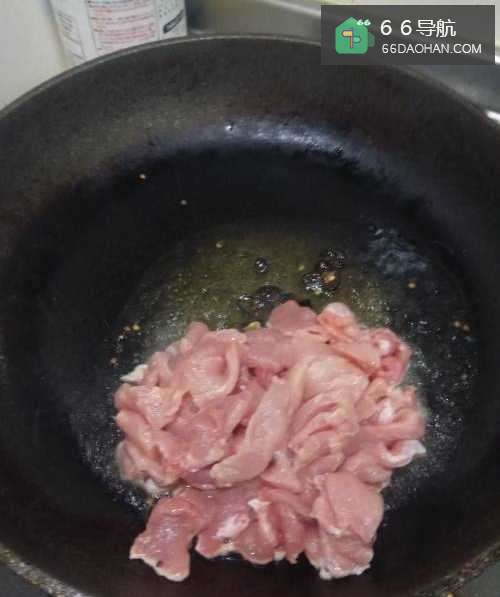 4辣椒爆香后,放入切好的猪肉,然后翻炒变色。