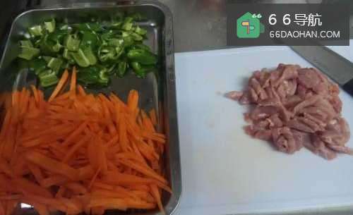 2胡萝卜去皮后清洗干净,然后切成细丝,青辣椒清洗干净去除种子,切成细丝,猪肉切成薄片。