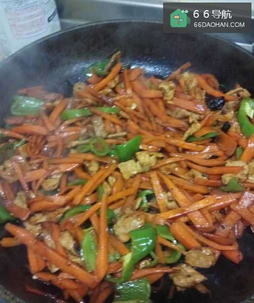 8翻炒一到两分钟后,就可以关火了,美味的青椒胡萝卜炒肉就做好了!