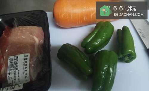 准备一块猪肉,一根胡萝卜,四个青辣椒,两个干辣椒,其他所有辅料。
