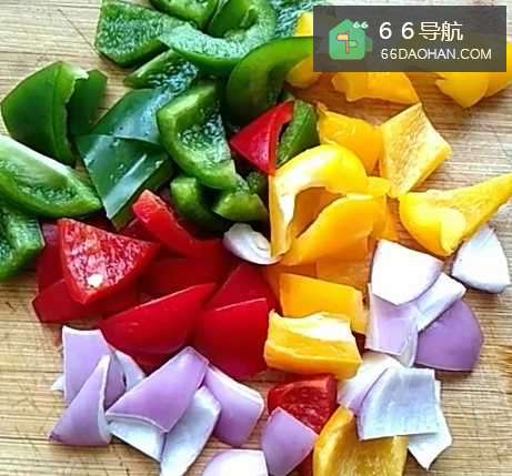 3把彩椒切成圈,洋葱切成块,烤肠切成厚片,锅内放油,放入切好的彩椒等;