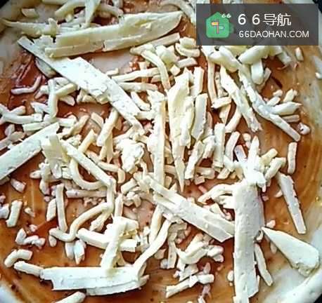 5刷上一层披萨酱,撒上一层芝士,然后把炒好的彩椒等放到上面,再撒上一层芝士;