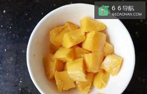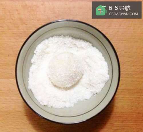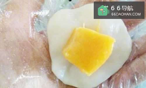 6将煮熟的糯米团分成大小差不多的小团子,取一个糯米团用手按扁,放上芒果粒,包裹起来搓圆,依次包裹好剩下的糯米团;