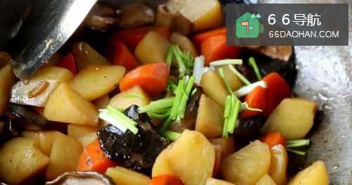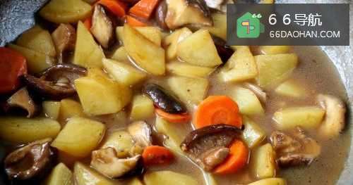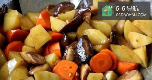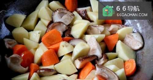 6放入香菇、胡侮施八萝卜、土豆块翻炒均匀;