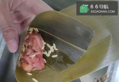 3将买好的粽叶放入开水中煮沸待其变色即可捞出清洗备用,将粽叶折成一个漏斗,将糯米放入其中后加入一到两块腌制的肉,再加入适量的糯米将肉包裹。