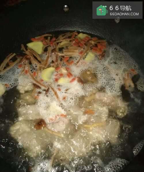 3将姜洗干净,切成片,再取一把枸杞,和猪尾骨、茶树菇一起放入锅里煮开;