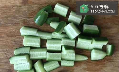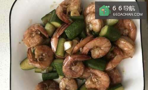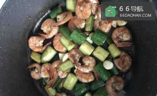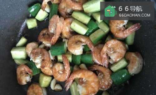 4锅里放底油,放大蒜炒香,放炸好的大虾和黄瓜翻炒。