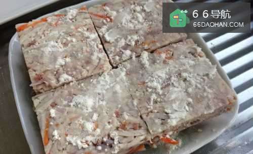 先在芋丝糕坯上,用手指沾上淀粉,掸撒在糕坯表面上,过多的淀粉,也尽量抹均匀。