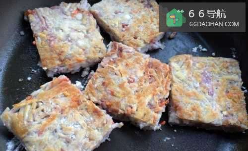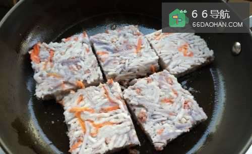 此时,轻轻晃动煎锅,糕坯会滑移,已经煎成有硬壳底面的芋丝糕与锅底摩擦时,会有轻微的“沙沙”声,表面糕坯的一面已经煎好。