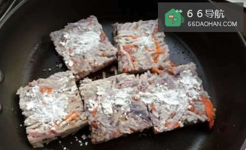 3改中小火,将芋丝糕沾有淀粉的那一面向下,放入煎锅中煎制约3~5分钟(视各人的炉具及火势而定)。