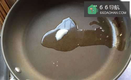 2大火把不粘平底煎锅烧至6分热,下5克熟猪油,晃动煎锅让猪油均匀散布。