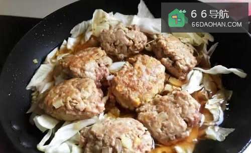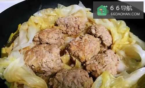 4铺上几片大片的包心菜,以保护肉丸,避免锅盖的水滴到肉丸上,盖上锅盖,用小火炖煮约1小时