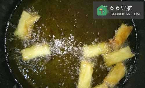 6待锅里的春卷都炸至表面呈金黄色、浮到油的表面时,春卷就炸好了。