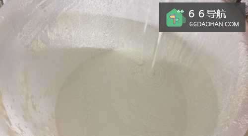6米浆发酵好后,盛出一锅的量,加适量的白糖、碱,用打蛋器充分调匀,每锅选择跟锅适量的分量,入锅后的厚度最好不要超过1.5cm