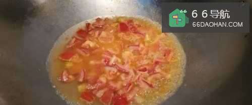 44、锅中放入蕃茄丁并加2米杯水煮软。