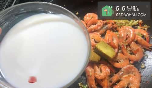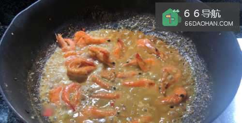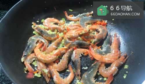 3接着,我们倒入鲜虾大火炒几下;