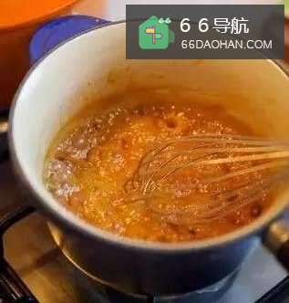 7利用时间间隔在酱汁锅内制作酱汁,放入白糖中高火力加热,等待焦化后倒入奶油并持续搅拌,直至糖与奶油完全融合后转至小火,放入香蕉片并继续加热5分钟