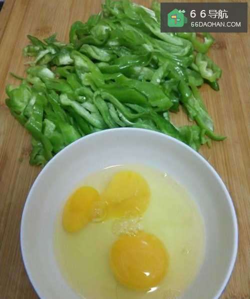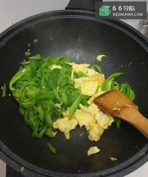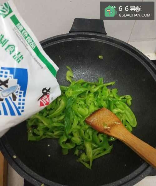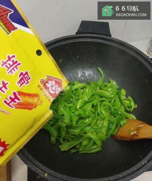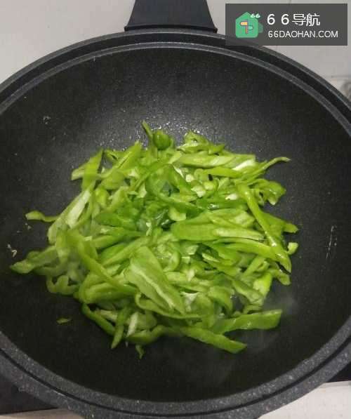 4将切好的青椒丝倒入锅中翻炒3分钟左右。