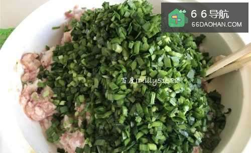 6先把肉馅调入味,然后加入韭菜一起拌匀。