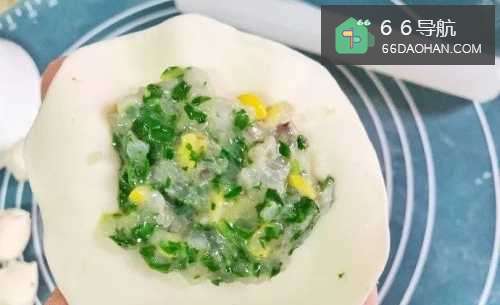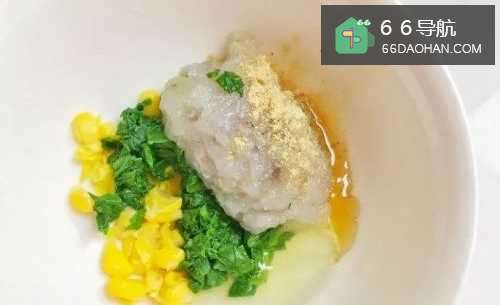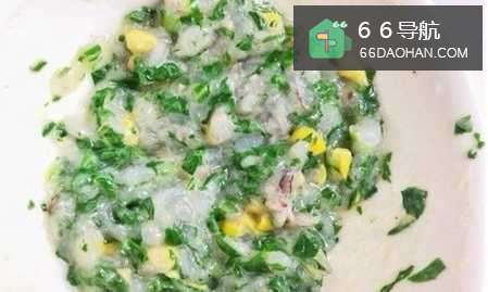 2油菜洗净大火焯水,取叶子剁碎,海虾剥壳去除虾线剁成蓉,玉米粒切碎,