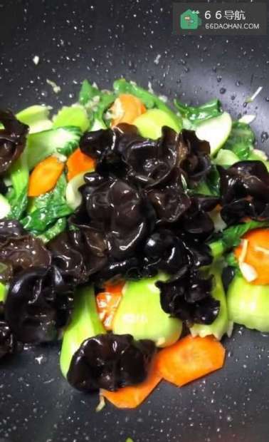 5下入油菜,大火爆炒,然后放入木耳和胡萝卜。