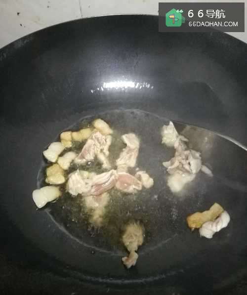 3接下来开始煮菜,先预热锅底,将肥肉放进去煎油,为了保险起见,最好事先倒入一点食用油做辅助。