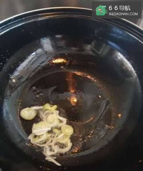 5锅中再放入少许花生油,油热后,将葱放入锅中炝出香味。