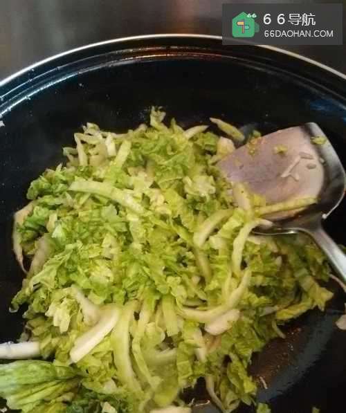 6将白菜先放入锅中,用铲子来回翻炒均匀。