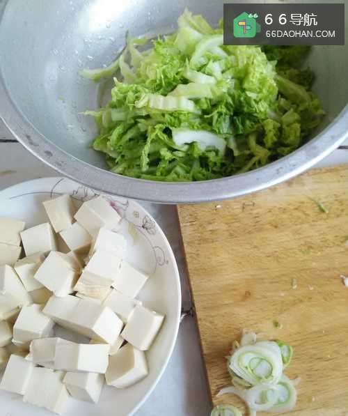 2将白菜切成丝,将豆腐切成均匀的小块,葱切成丝。