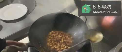 4辣酱炒制完成,放入肉沫爆炒,肉沫爆香后掉入前面我们切好的豆腐,加入豆腐后记得加入一些水,可以让豆腐更入味,炒好以后,加入一些盐和鸡精。