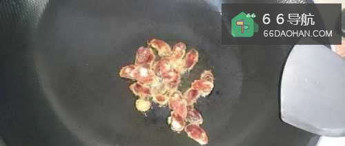 3热锅倒油,放入腊肠煸炒至微焦,切记油温不要过高,不然腊肠很容易就糊掉了。