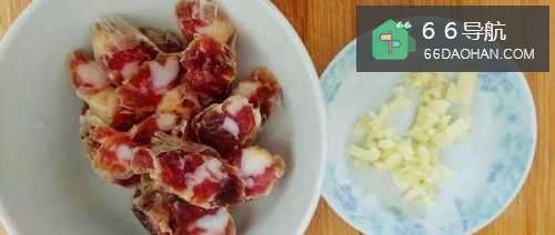 2腊肠斜刀切片,蒜头切末。