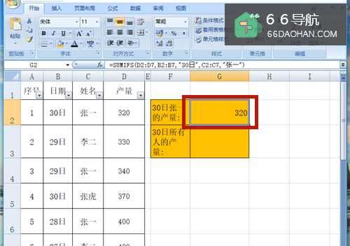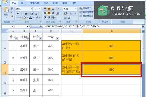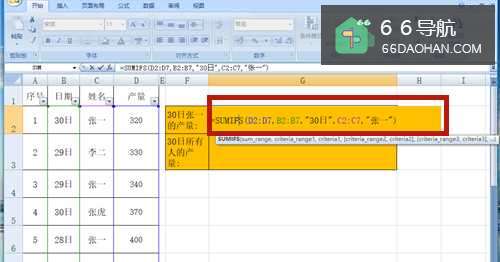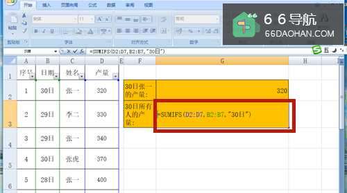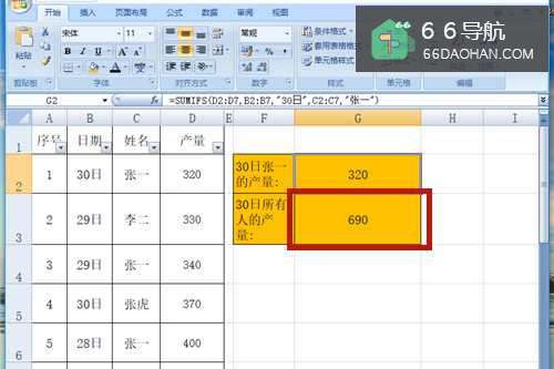 2在G2单元格中输入公式【=SUMIFS(D2:D7,B2:B7,"30日",C2:C7,"张一")】。
