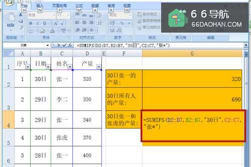 6在G4单元格,输入公式【=SUMIFS(D2:D7,B2:B7,"30日",C2:C7,"张*")】。