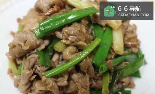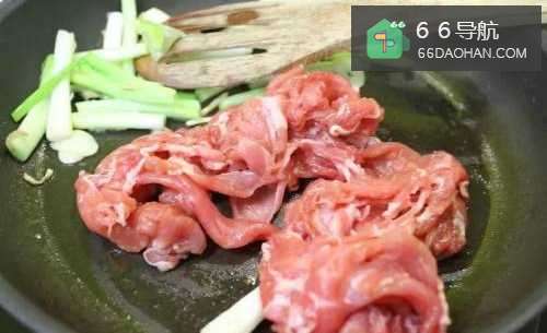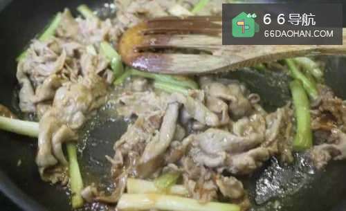 3起一个油锅先爆香葱白、姜丝、蒜末,待香味都出来后,再把腌好的猪肉片加入拌炒