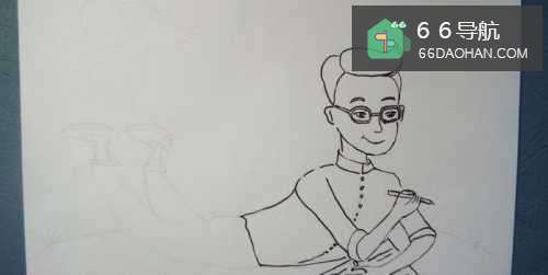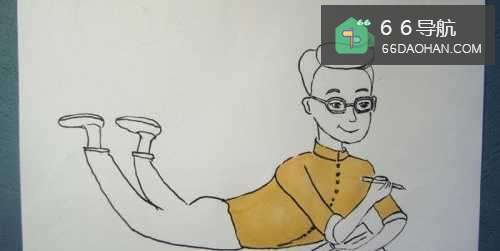 接着,用黑色的勾线笔画出爸爸人物图形的身体和手臂部分,注意爸爸手上拿着的笔要仔细画出来,如下图所示。