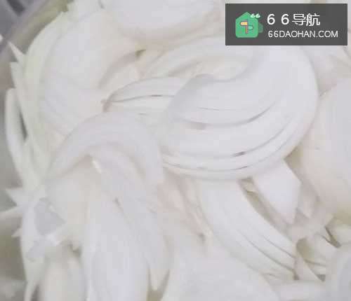 3然后把洋葱切成丝,因为会辣眼睛,可以把刀,洋葱都泡一下水