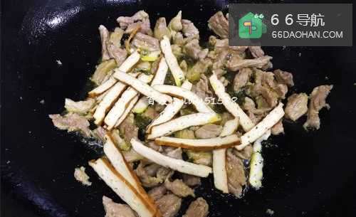 4倒入豆干和瘦肉一起翻炒几下。