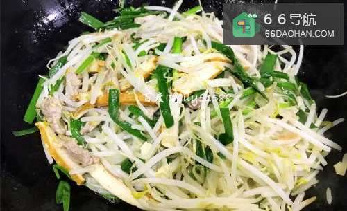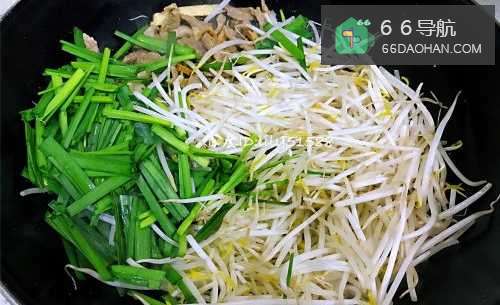 5把豆芽和韭菜一起倒进去,用大火快炒几下。