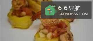 7取一面包片放上番茄粒和苹果粒,再在果粒上面摆上虾