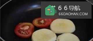 5在煎过面包片的锅内放入苹果片和番茄片(番茄不宜煎太久)取出切成小粒