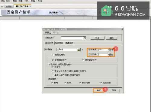 3在固定资产清单方案设置界面,选择【会计年度、期间】,点击【确定】。