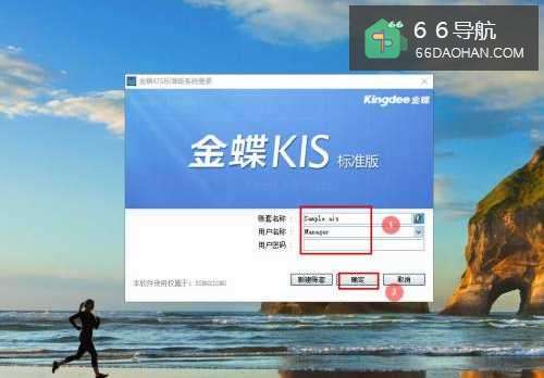 打开KIS软件,选择【账套】,输入用户名和密码,点击【确定】;