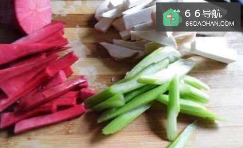 2杏鲍菇洗净七成长条,泡胭脂萝卜也切成条,芹菜切段