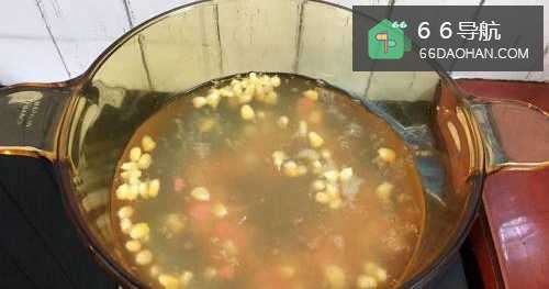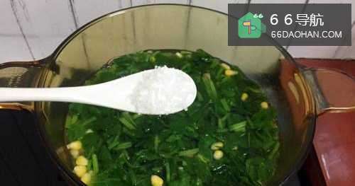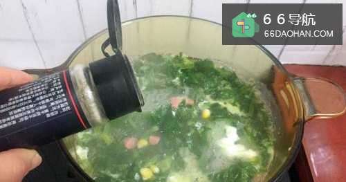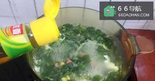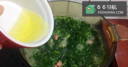 13再次煮开时淋上打匀的蛋清,搅拌均匀