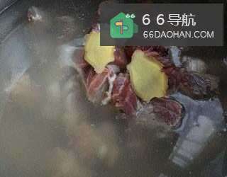 5锅中入水放入牛肉块,加料酒和姜片焯水捞出。