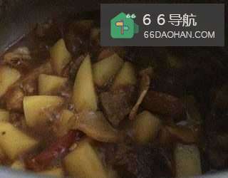 12牛肉熟后排气打开盖子,放入土豆同炖煮。