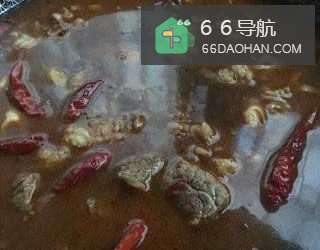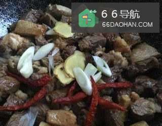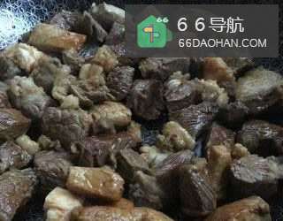 6炒锅入油烧热放入冰糖炒糖色,放入牛油煸炒,放入牛肉块翻炒。